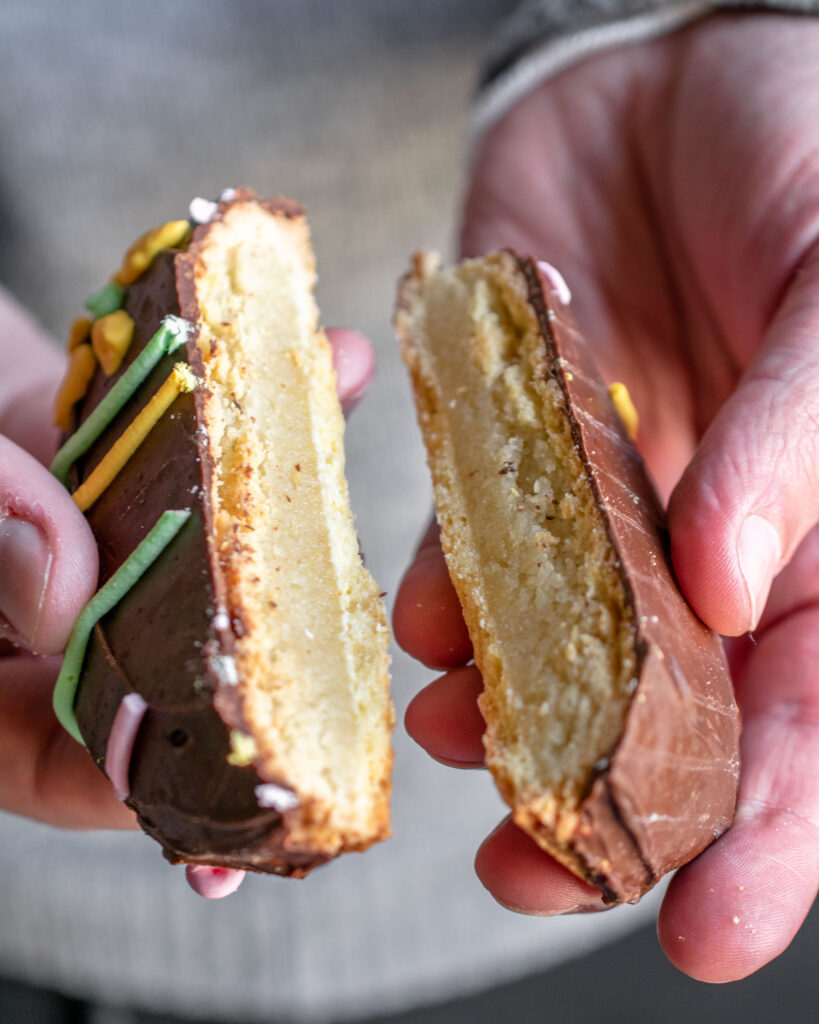 Traditionally, figolli are bright and colourful, decorated with royal icing in elaborate designs and with a half chocolate egg wrapped in foil in the middle. Nowadays, figolli are frequently decorated with a thick layer of chocolate and sprinkles or other candy. I personally prefer digging into a chocolate covered figolla, although I will never refuse a royal icing covered one! In this recipe, I’m making my figolli with melted chocolate and nuts. However, I encourage you to experiment and express your creativity while decorating them!