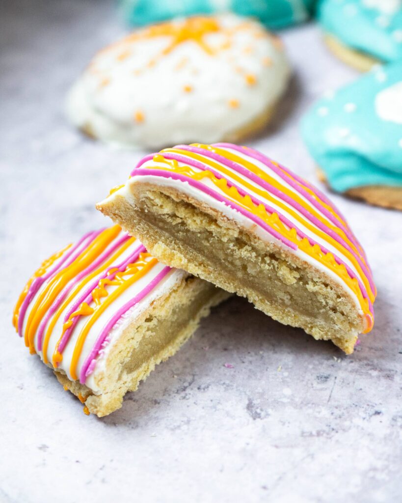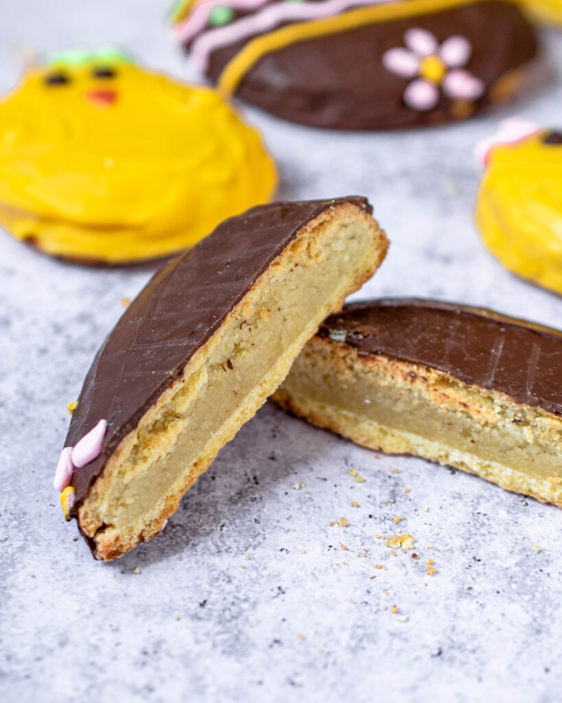 Figolli (sing. figolla) are a Maltese Easter treat. A soft almond filling is sandwiched between two large lemon and orange flavoured biscuits. Afterwards, the figolli are covered and decorated with a layer of royal icing or chocolate.