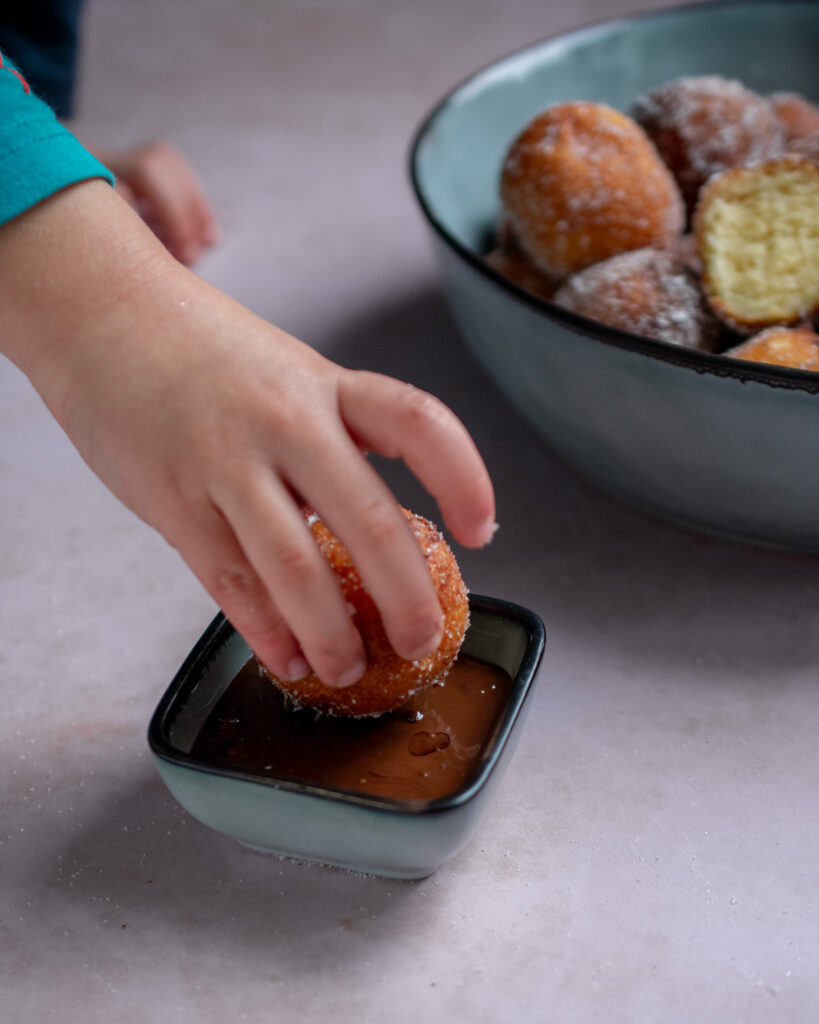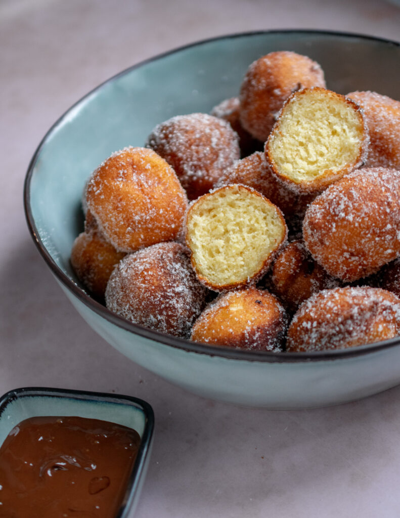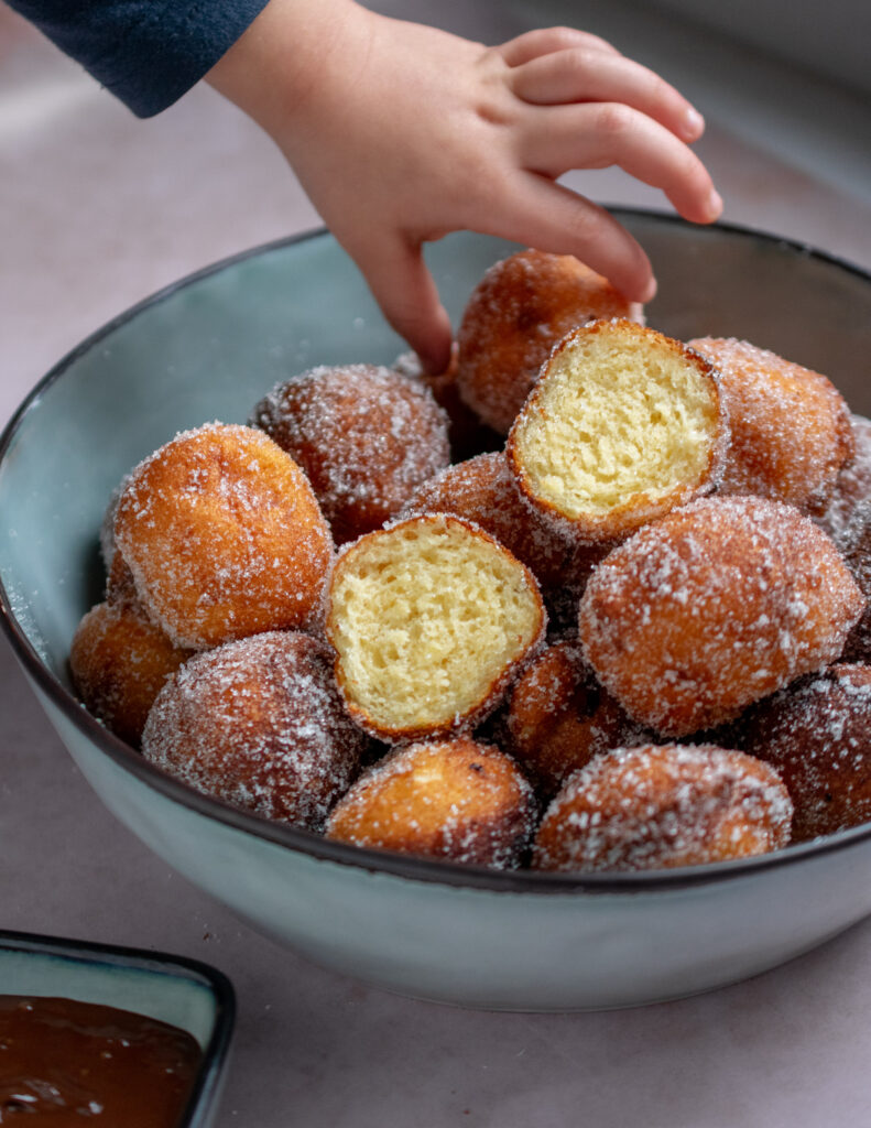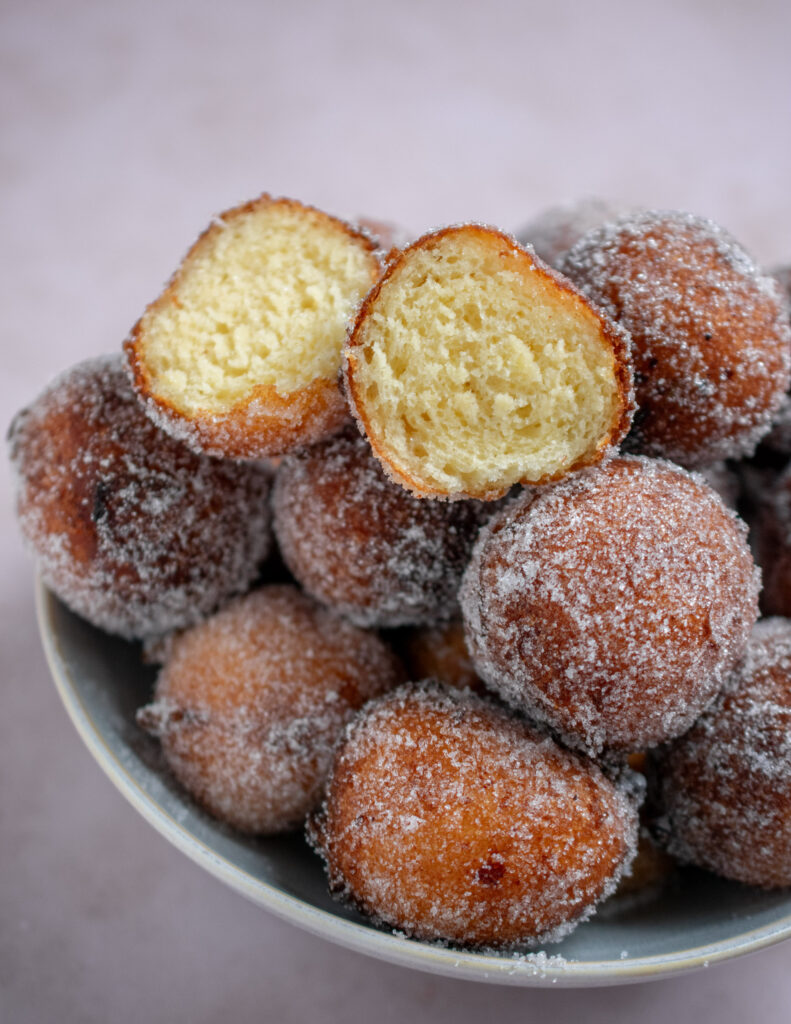 Because to make quarkbällchen baking powder is used instead of yeast, there’s no need for rising time, so the dough comes together quickly and easily. However, I would suggest to let the dough rest for at least 15 minutes before frying as this will help the gluten and flour relax, which will give a softer and fluffier quarkbällchen.
