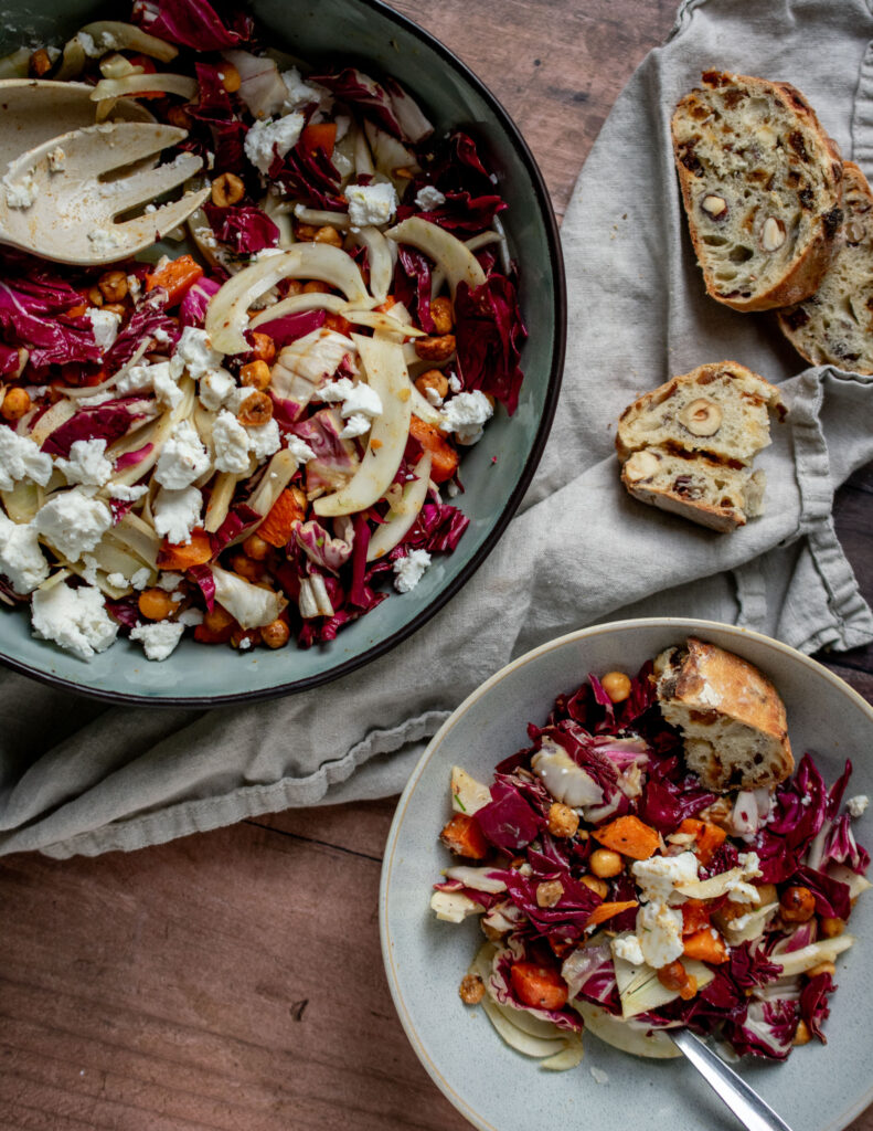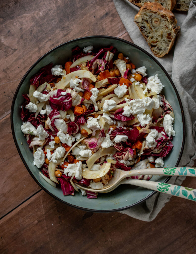 During the winter months there is also this dilemma about salads, however, salads aren’t just a summer meal! On the contrary, there are so many winter vegetables that make such good rich and warm salads, that it would be a pity not to explore. With bold flavours this salad is a must to make when this fresh produce is in season. Sweet roasted pumpkin, bitter radicchio, crisp fennel, toasted hazelnuts, creamy goat cheese and crunchy chickpeas come together in this vibrant salad. With a bright orange dressing it truly makes this salad satisfying as it is elegant.