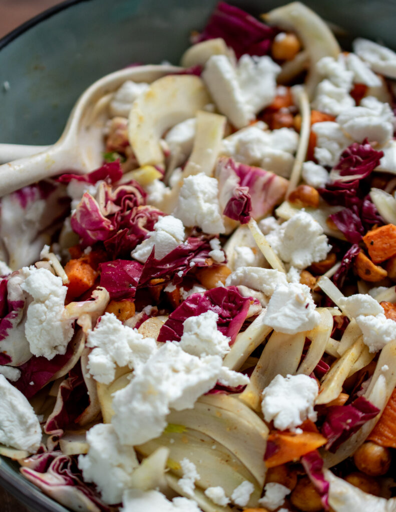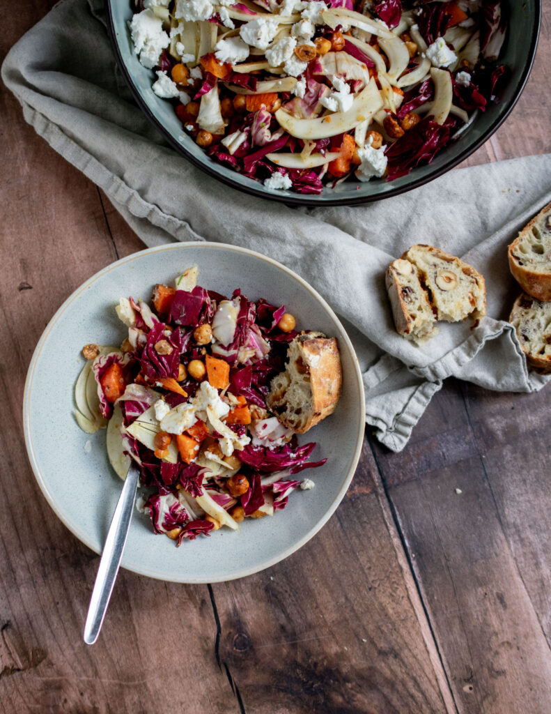 This is Winter Radicchio Salad is a game about contrast and balance. Bitter radicchio, sweet pumpkin, crispy chickpeas, fresh fennel, toasted hazelnuts, and creamy goat cheese. Everything tied up with a bright orange dressing.
